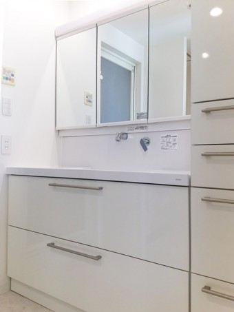 清潔感があり、掃除がしやすい洗面化粧台にリフォームしたいと考えていました。 収納する量もけっこうあるので、三面鏡で収納したものがみえない化粧鏡が希望でした。