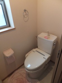既存の便器が元々気にいらず、洗浄便座も大きくお手入れがしにくい ものでした。 洗面化粧台の交換が第一優先順位でしたが、1・3階にあるトイレも内装と一緒にリフォーム。 アクセントクロスで雰囲気も明るくなりました。