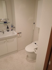 ブルーのクロスの奥行き効果で爽やかトイレを演出 渋谷区