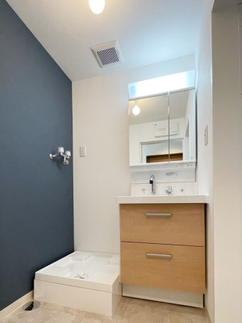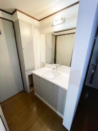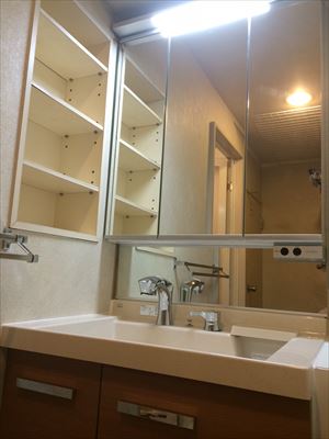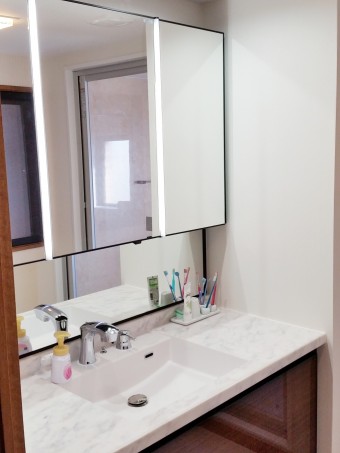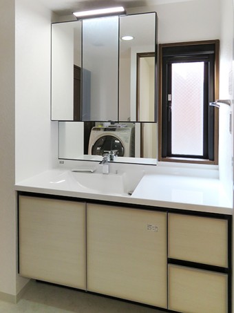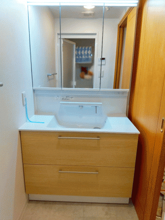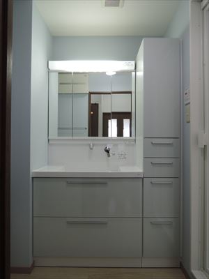洗面化粧台は三面鏡をご希望でした。 設備機器お取替と合わせて給排水の更新工事もさせて頂きました。