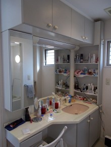 在来工法の浴室をお使いだったK様。目地のカビや足元の寒さが気になっており、リフォームをご検討されていました。浴室のリフォームと合わせて洗面化粧台もキレイにしたいと合わせて工事をさせて頂きました。 今回は洗面化粧台のリフォームをご紹介します。