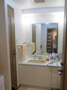 梁がむき出しなのが気に入らない。床材も安っぽい。 清潔感と高級感のある洗面室にしたい。というご希望でした。